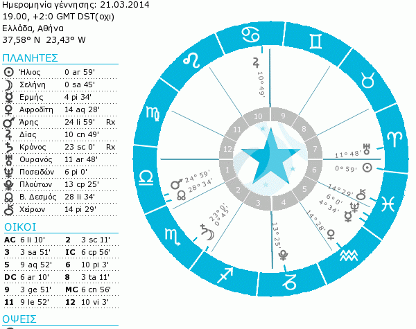 Ας δοκιμάσουμε μια ώρα μεταξύ 17.39 (που η Σελήνη μπαίνει στον Τοξότη) και 19.27 (που το τρίγωνο Σελήνης και Ήλιου γίνεται ακριβές) στις 21/3. Εν πρώτοις, μια Παρασκευή βράδυ φαίνεται αν μη τι άλλο πιο βολική για την τέλεση ενός γάμου! Ας υποθέσουμε πρώτα ότι οι όρκοι δίνονται (με τον ένα ή τον άλλο τρόπο) στις 19.00 (ο χάρτης δίνεται παρακάτω).