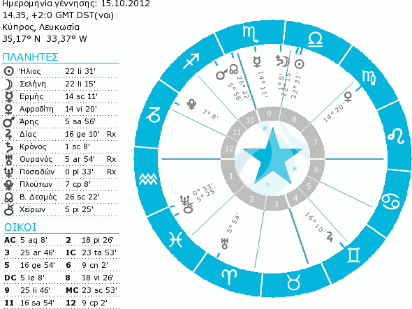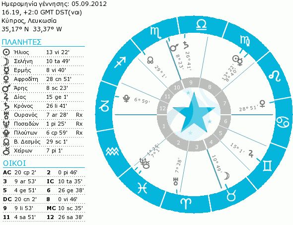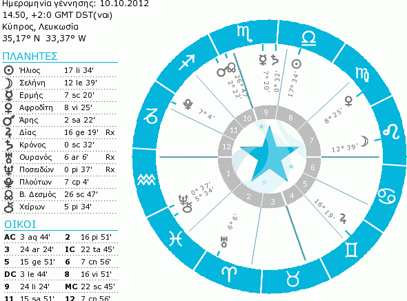Ρίχνοντας μια πρώτη ματιά σε αυτό το χάρτη, εύκολα παρατηρούμε κάποιους από τους κανόνες που θέσαμε να ικανοποιούνται. Όπως "απαραίτητα" θα θέλαμε, η Αφροδίτη δεν είναι ανάδρομη (δες το αντίστοιχο άρθρο - κάνε κλικ εδώ) και η Σελήνη από τον Ταύρο δεν είναι σε τροχιά κενή πορείας και μάλιστα πρόκειται να σχηματίσει όψη τριγώνου με τον Ήλιο στην Παρθένο. Παρατηρώντας λίγο πιο προσεκτικά, διαπιστώνουμε ότι το τρίγωνο αυτό είναι και η τελευταία όψη που θα σχηματίσει η Σελήνη προτού αφήσει το ζώδιο του Ταύρου (η Αφροδίτη "αφήνει" τον Καρκίνο προτού σχηματιστεί εξάγωνο ακριβείας από τη Σελήνη). Επομένως η επίσης απαραίτητη προϋπόθεση της αρμονικής τελευταίας όψης της Σελήνης προτού μπει σε τροχιά κενή πορείας, πληρούται επίσης. Ταυτόχρονα έχουμε αποφύγει τις "κακές" θέσεις τόσο για την Αφροδίτη (δες το αντίστοιχο άρθρο - κάνε κλικ εδώ) όσο και για τη Σελήνη αλλά και μια τυχόν ανάδρομη πορεία του Ερμή. Δεν έχουμε μια Σελήνη σε "γέμιση" (βλέπουμε στο χάρτη πως η απόσταση μεταξύ Ήλιου και Σελήνης είναι μεγαλύτερη από 180 μοίρες, είμαστε επομένως μετά την Πανσέληνο), κάτι επιθυμητό αλλά όχι απαραίτητο. Το ίδιο ισχύει και για τη σχέση μεταξύ Αφροδίτης και Άρη. Αν και οι πλανήτες είναι και οι δυο σε υδάτινα ζώδια - Καρκίνο και Σκορπιό αντίστοιχα - δε σχηματίζεται μεταξύ τους όψη (ας θυμηθούμε ότι την επιλεκτική την ενδιαφέρουν οι συγκλίνουσες όψεις ανεξαρτήτως ανοχής).
